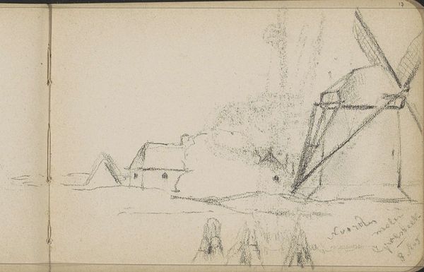 Editor: Willem Cornelis Rip’s "Huizen aan het water te Zaandam," created in 1895 using pencil and pen, captures a waterside view. I’m struck by how simple and fleeting it feels, like a memory quickly sketched. What stands out to you? Curator: The sketch carries the weight of visual tradition. Notice how the linear strokes used to delineate the buildings and reflections on the water resemble pictograms? Each line and shading not only depict a detail but are imbued with collective associations of home, stability, and reflection. Do you perceive a cultural memory embedded within these strokes? Editor: That's interesting, I hadn't thought about the strokes themselves carrying meaning. I was more focused on the overall scene. Do you see specific symbols at play here? Curator: Indeed. Consider the water. Water has always held symbolic meaning: it represents both tranquility and the subconscious, fluidity and the potential for chaos. Here, it mirrors the buildings, suggesting a duality, an external representation of an internal world, and the way we project our understandings of ourselves in external structures. Is there a yearning to translate lived experience into stable form? Editor: I can definitely see the dualism now, between the solidity of the houses and the shifting, reflected reality in the water. It does make me think about how we try to find ourselves in our surroundings. Curator: Precisely! Rip invites us to consider how places are not just physical spaces but emotional and psychological landscapes where our cultural and personal narratives intertwine. It allows one to reconsider everyday landscapes as mirrors reflecting one's inner condition. Editor: Thank you, I now appreciate that such a seemingly simple sketch invites such rich reflections!
