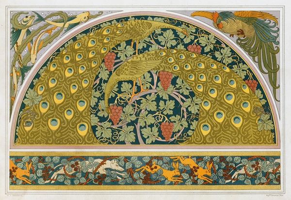 Curator: Albert Eyth's "Bread Tray," likely rendered around 1937, offers an intimate glimpse into daily life elevated by artistic expression. It’s primarily a watercolor and drawing. Editor: Oh, it has such a curious gravity! Like it’s holding more than just bread... a history of shared meals and hushed conversations. It projects stillness; a sense of holding the moment. Curator: I'm intrigued by the symbolic language at play. Look closely: what feelings or memories does the artist invoke with the careful choice of the gold floral flourishes against that darker backdrop? Do the botanical motifs suggest abundance, a blessing on the domestic sphere perhaps? Editor: Absolutely, it’s about blessings! I feel there's a yearning towards simpler times, an emphasis on home and hearth, yet tinged with melancholy, too; that dark grey reminds me of times that were not so sweet... it tempers the overt prettiness with an honest acknowledgment that joy and shadow coexist, wouldn't you agree? The very shape seems significant – oval echoes the form of an eye; does it observe us as we observe it? Curator: It’s interesting how those art deco floral motifs manage to be simultaneously joyful and somehow quite reserved. Eyth doesn't go all out in decorative enthusiasm, which mirrors the artist's quiet dignity and reserve. It's decorative art with soul. Editor: Yes, the limited palette! The austerity amplifies, for me, the gold accents, reminding us how precious those golden moments in life can be, especially when shared with loved ones around a table laden with sustenance and warmth. Curator: So, despite its modest subject matter and simple medium, what enduring truth about ourselves do you feel "Bread Tray" seems to whisper, finally? Editor: Well, the artwork makes me believe it’s more than just decorative flourish— it serves to illuminate something quietly essential about our human condition, our fragile joy, set within inevitable shadows. It invites meditation, doesn’t it? On memory, absence, and quiet endurance, finally. Curator: Beautifully put; Eyth manages to encapsulate the sacred ordinary in just a tray, bread and watercolours. A modest victory!