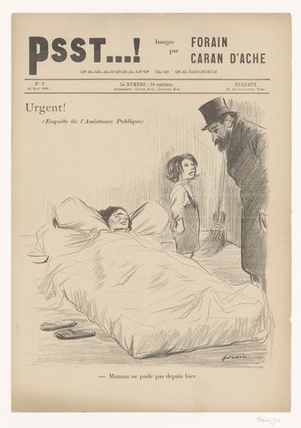 Curator: Right now we are looking at the magazine cover of *Le Rire*, dated March 24, 1906, which is held at the Minneapolis Institute of Art. It’s a lithograph in the Art Nouveau style. What do you see here, Editor? Editor: Well, immediately, there's this wonderfully scandalous energy about it, right? The colors are delicate—lots of pastel pinks and yellows—but the subject matter… it's a boudoir scene gone topsy-turvy. There's a woman peering under the bed, ostensibly surprised by the man hiding there. A classic farce, visually speaking. Curator: Exactly! And the lithographic process, allows for the relatively mass production of these images which enabled its accessibility in broader society. It served a specific social function, circulating satirical views and, of course, reflecting the societal fascinations with gender and class dynamics. Editor: Right, because you can almost smell the ink, can’t you? I mean, you can almost hear the rustling of the pages as someone bought this on the street corner. Think of the context—Paris, early 20th century—such a breeding ground for pushing boundaries and the avant-garde. Curator: I'm drawn to the textual elements incorporated directly into the artwork. Look at the title, "Le Rire," which means "The Laugh." The dialogue scrawled across the bottom adds another layer, hinting at societal games and expectations. Also, this form democratized artistic expression as illustration was embraced by more accessible media, moving artwork from traditional displays in formal galleries into newspapers. Editor: And let's be honest, the composition is great. Your eye is pulled down and then immediately up and back in the composition and finally… oh, that coy smirk lurking in the shadows, waiting for an opportunity. Curator: It prompts us to think critically about artistic consumption and artistic creation, as the accessibility provided by lithography created art that could be consumed broadly rather than kept at the pedestal, and the democratization created further forms of media. Editor: True. It's amazing how much story and suggestion can be packed into a single image, isn’t it? Almost dreamlike and humorous, leaving more unsaid than stated explicitly. Curator: Indeed, leaving a little space to ponder about these images today! Editor: Makes you appreciate how a good drawing, rendered through the correct medium, really does stand the test of time!