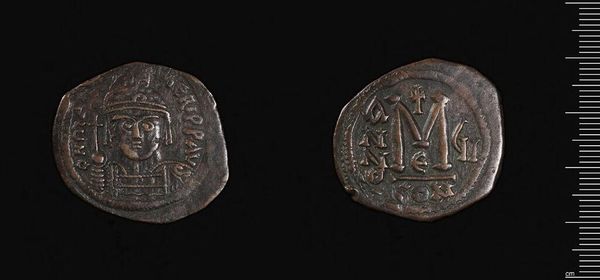 Curator: This is a coin crafted under Justin II, residing here at the Harvard Art Museums. It weighs in at just under 14 grams. Editor: It feels ancient, weighty with history, even though it's so small. I can almost smell the marketplace where it changed hands. Curator: Note the meticulous detail; it's a testament to the engraver's skill, rendering authority and value through symbolic form. The 'M,' a denomination mark, anchors the composition. Editor: I'm drawn to the wear and tear. Each scratch whispers a story. It's like holding a tiny, tangible link to the past. Curator: Precisely. The coin's materiality also invites contemplation on value systems—both economic and symbolic—of a bygone era. Editor: Right, the layers of meaning embedded are pretty dense. It makes you wonder about the hands it passed through, the lives it touched. Curator: Indeed, this coin serves as an eloquent fragment, inviting us to ponder Byzantine artistry and political assertion. Editor: So, what began as simple currency now invites us to consider history’s enduring, sometimes mysterious, presence.