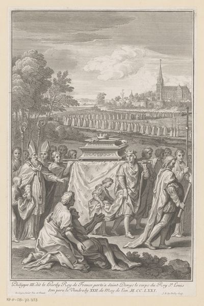 Curator: This is "Drie mannen disputeren in de tuin," or "Three Men Arguing in the Garden," an etching and engraving by David Coster, made sometime before 1752. It presents a scene brimming with contained tension, wouldn't you say? Editor: Indeed. The stark black lines of the engraving emphasize a rigid formality in the garden, especially the architecture. But there's also something unsettling about the contrast between the three men's intense conversation and the seemingly idyllic setting. I immediately zoom in on the labor involved to construct and maintain that perfectly geometric garden! Curator: Absolutely, the setting amplifies the message. Notice how the formal garden and grand architecture seem to dwarf the figures, perhaps alluding to the constraints and expectations placed upon them by society? It also feels as though this reflects ideas from a past, not exactly our moment in time. Editor: That's what catches my attention: what was the process involved in translating the artist’s vision into this material form, through the repeatable media of engraving and etching? Think about the social hierarchies embedded in who gets to be depicted, and what kind of stories get to be told, across class lines. Curator: It's fascinating how the composition leads our eye. The open doorway invites us to look in and further wonder at the figures in the background seemingly removed from the dispute at the foreground. The light source makes me think about truth versus illusion and insight through discussion. Editor: I find myself drawn to the repetition. Those carefully planned arches… were these designed and created by other labor? Or could the same person or workshop that conceived of them also do the labor? And where does Coster fit into that division of labor and the hierarchies of skills involved? Curator: Perhaps these symbols speak of a world defined by discussion, order, and an almost theatrical staging of social life? Editor: These prints were clearly crafted as luxury items aimed towards a specific audience, while the garden signifies the control of nature through significant investment. Curator: That has broadened my interpretation! Now it does make sense. I can only ponder who they may have represented or hoped to capture with the artwork! Editor: Well, I feel like I’ve gotten a closer look into the making and significance behind it. I am left questioning what we prioritize materially as art and craft today.