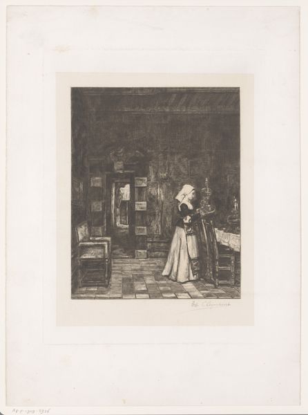 Curator: Standing before us is "Keukenmeisje," or "Kitchen Maid," a piece from before 1890 currently residing here at the Rijksmuseum, created by Jan Mesker. It's a print made with ink, using the engraving technique. Editor: My initial feeling is one of quiet contemplation. There's a subdued energy; she’s almost spectral against that kitchen background. She is there, but not. It feels heavy somehow. Curator: Absolutely. The realism emphasizes her role, reflecting genre painting conventions, focusing on everyday life and the individual’s place within it. But I think there's something deeper than just documenting daily chores here. Consider how women were often presented, and this very natural pose... it is not quite "pin-up," but the quiet beauty it emanates has appeal, don't you think? Editor: Definitely. It's interesting that he captures her not as a romantic ideal, but simply *being*. Her gaze is cast downward; what are her thoughts? Maybe she's dreaming of better things or simply thinking about the dinner for this evening. Curator: Her anonymity is key, yes. It could be any kitchen maid. Still, look at her gaze—her averted eyes resonate with common pictorial allegories for melancholy. She stands for the ordinary and the ideal all at once, a cultural archetype of domestic life with this undercurrent of interiority. Editor: You know, her stance reminds me of some early photographs I've seen... that captured a similar melancholic essence. It feels connected. The simplicity in execution allows us to enter her space – her kitchen space, her mental space, too, maybe. Curator: It’s the symbols, too, consider. That domesticity would symbolize a realm of order and control, a space both intimate and utterly defined by function, both personal, and alienating. A paradox is visualized. Editor: So true, Jan Mesker captured that tension between labor and interior life – a testament to the quiet, reflective moments that can occur even amidst the mundane. It's more than a portrait; it is a statement about women's experiences. Curator: An intimate visual statement, certainly; the symbolic gravity continues to pull at our minds across the centuries. Editor: I'm finding myself drawn deeper into these subdued tones and the mystery surrounding her inner world, just amazing.