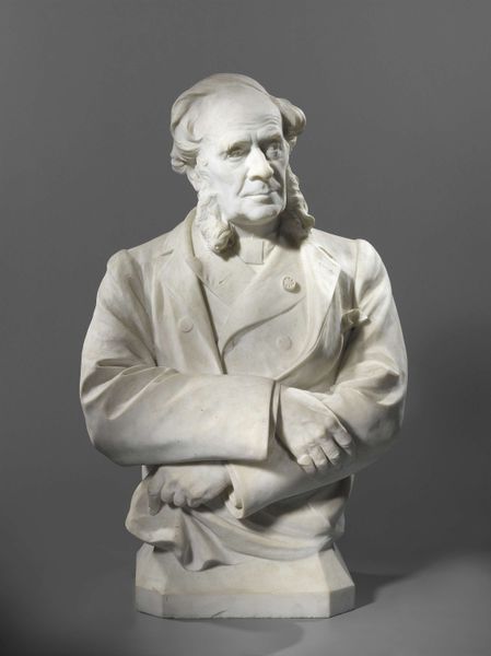 Curator: Here we have Jean-Baptiste Pigalle’s bronze sculpture of Jean-Rodolphe Perronet, completed around 1785. It’s an interesting piece that really reflects the Neoclassical style. Editor: My first impression is one of quiet power. There’s a restrained intensity in his gaze and in the way his jaw is set that seems quite deliberate. The dark bronze enhances that gravitas. Curator: Absolutely. Perronet was a renowned bridge builder, and this portrait encapsulates that status perfectly. But it's vital to consider the sociopolitical context in which Pigalle was working. The late 18th century in France was a period of great upheaval, and this bust, like so many other works of the time, engages with notions of power, legacy, and revolution, however subtly. Editor: I'm immediately drawn to the symbolism in the details—the careful rendering of the wig, for example. It speaks of status, but it also speaks to a performative aspect of identity. The wig and formal attire served as an external expression of established norms during this time period. Curator: Precisely. Pigalle isn't simply depicting Perronet; he's creating an emblem. He wants us to understand how Perronet aligns—or perhaps deliberately sets himself apart—from certain political trends of the moment. Looking at the history, one is compelled to note his contribution to the École des Ponts et Chaussées, or National School of Bridges and Highways, and consider how figures like Perronet facilitated France's transportation system at the expense of more just distributions of economic resources. Editor: This piece embodies contradictions; on one hand we have his stern, knowing eyes representing accumulated wisdom; but in constrast the rigid formality of his presentation reflects an entrenched, perhaps ossified social hierarchy. I think viewers need to consider whether he, even through representation in art, has truly earned his serious stature, or if it's more complex than that. Curator: Indeed, the artist, by fixing him permanently in bronze, asks future viewers to remember, to critique, and to evaluate his life and his labor. Editor: Examining symbols alongside sociopolitical factors gives us deeper appreciation of the piece as well as its lasting resonance. Curator: It leaves you contemplating what success, and who history remembers, looks like then, and now.