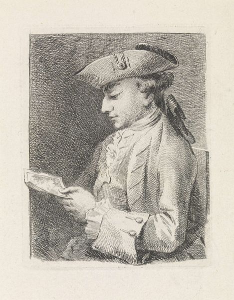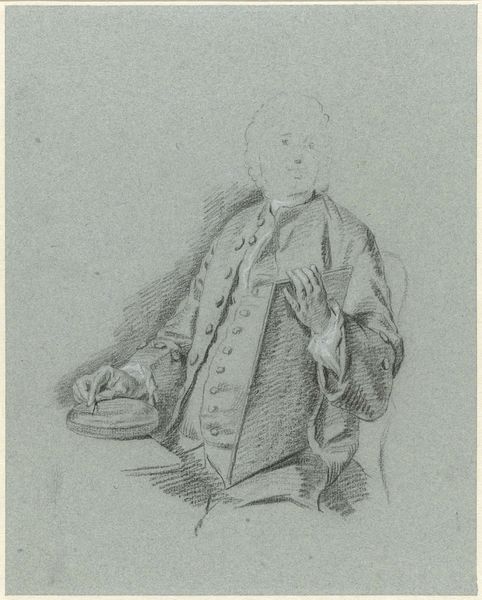 Curator: This is "Portrait of a Distinguished Young Man," a knee-length portrait drawing by Thomas Gainsborough. Editor: He seems rather demure, almost apprehensive. The soft greyscale and sketch-like quality create an air of gentle melancholy. Curator: It's interesting that you note the sketch-like quality, since Gainsborough primarily worked as a painter. This drawing, made with graphite pencil and chalk, gives us insight into the process, showing his construction of form and light. Were drawings such as this, exercises or commissioned works? Who was buying drawings? And how were they priced? These questions offer tangible points from which to re-evaluate how the hierarchy between painting and drawing came to be constructed. Editor: Absolutely, and examining its social context enriches our interpretation. The young man’s reserved pose and expensive clothing—even rendered simply, it speaks of class and privilege. There's an almost uncomfortable contrast between his delicate demeanor and the realities of wealth acquisition in 18th-century England. Did this privilege come from slave labor, colonial exploitation? That reality lurks beneath the surface for me, complicating the elegance of the portrait. Curator: The details matter so much when we consider materials and their origin. Where did the pencil lead come from? Who was processing it, what were their lives like? These raw materials offer another lens through which to read this young man, who looks very far removed from the toil of the mines. Editor: It also forces us to consider how Gainsborough himself, despite achieving fame and wealth, navigated that same social structure, producing art for an elite class. Curator: Indeed, there's a push and pull—artist as craftsman, balancing social commentary with financial necessity. Understanding the labor embedded within art-making demystifies the creative process and throws those power dynamics into sharp relief. Editor: By acknowledging these complex threads, we invite viewers to connect with the portrait beyond its aesthetic appeal, understanding its implications and history as it speaks to modern-day issues. Curator: This piece, at the Städel Museum, truly exemplifies how understanding art involves decoding process, material, and socio-economic conditions. Editor: It is through that expanded perspective that art becomes a vibrant dialogue between then and now.