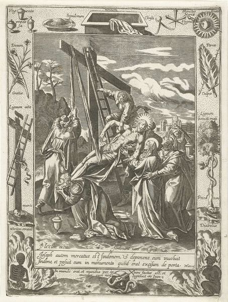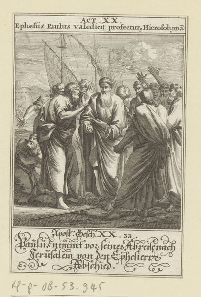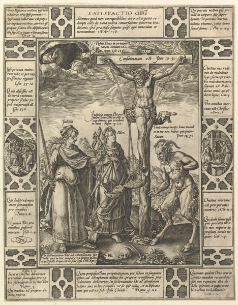 This anonymous print, titled "Judit onthoofdt Holofernes," captures a dramatic biblical scene with stark lines and intricate detail. The composition is organized around Judith, who stands centrally with a raised sword, the lifeless Holofernes slumped beside her. The scene is tightly framed, creating a sense of claustrophobia, which amplifies the violence depicted. The artist employs hatching and cross-hatching techniques to create depth and shadow, emphasizing the texture of the fabrics and the musculature of the figures. This method contributes to a complex interplay of light and dark, intensifying the emotional impact of the scene. The organization of the image space creates a binary opposition between Judith's clear, decisive action and Holofernes' passive defeat. The formal elements underscore the triumph of virtue over tyranny, yet the visual brutality also invites reflection on the darker aspects of power and resistance. Art doesn't provide answers; instead, it poses questions.