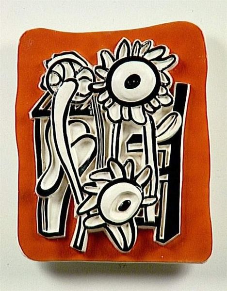 Curator: The first thing that strikes me is its boldness. It feels like a declaration, a statement of pure visual energy. Editor: Absolutely. Fernand Léger's "Sunflowers," created in 1954, presents a vivid interpretation of a classic subject through the lens of what some might call pop art, showcasing a masterful manipulation of color and geometric forms. Its current home is the Musee National Fernand Léger in Biot, France, cementing its place in the artist's legacy. Curator: For me, it immediately calls to mind the kind of optimism we often find in art from this period – post-war, rebuilding, looking forward. But it's more than just simple happiness. The rigid lines and sharp angles also convey a sense of structure and order. It's like Léger is showing us a world where even nature can be engineered for maximum impact. Editor: Exactly! The sunflower, traditionally a symbol of adoration and warmth, is reinterpreted here in a way that engages with the growing visual language of industry. The flat planes and delineated edges are hallmarks of Léger's machine aesthetic, connecting the natural with the mechanical. Notice how the pop of colors enhance the visual dynamism. Curator: There's also something about the flatness of the image that adds to its modernity. By abstracting the sunflower to its basic geometric shapes, Léger transcends the individual flower and points to the archetypal idea of the "flower". The black dots add a sort of visual punctuation, drawing our eye and anchoring the composition. Editor: And let's consider its presence in the museum space. "Sunflowers" serves as an emblem of Léger’s engagement with popular culture and his utopian vision, a perfect symbol in this gallery. Curator: It does bring up the relationship between the image of something and the object itself, doesn't it? Léger compels us to ponder about how something iconic gets filtered and shaped across different times. Editor: Seeing such an emblem is thought-provoking. "Sunflowers," born from color, form, and cultural perspective, makes a powerful point, even this far away from its origination.