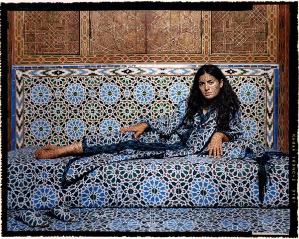 Curator: Lalla Essaydi's "Harem #10," made in 2009, is before us—and right away, it feels less like a photograph and more like a meticulously crafted dream. The way the woman is lying, so still…almost entombed, isn’t she? Editor: My first thought went straight to textiles! The sheer abundance of patterns – geometric tiling underfoot, and the woman’s ornate robe… it’s all about the interplay of these constructed materials. Curator: Constructed indeed. The photograph is almost claustrophobic with pattern. It dances on her skin, a script, almost, or a veil…What is she writing on herself, and what’s being written upon her? Essaydi often uses henna, traditionally applied to women's skin before marriage. Editor: Exactly! That shifts the focus to henna’s application. It's not just surface decoration; it’s about adornment *as* a practice, the physical labor and the culturally loaded rituals, repeated motifs like labor itself…And think of the layers of mediation; from pattern maker to garment maker to the model as artist's material. Curator: And then Essaydi’s camera! I can’t help but see this through the lens of Orientalism, that exoticised Western fantasy. Yet Essaydi subverts this expectation, right? She’s a Moroccan woman reclaiming, deconstructing…or even haunting that space. Editor: The means are fascinating to me: consider photography as an inherently *reproducing* medium. What’s produced – image, narrative – is always the product of someone's labor and for what aim? Whose "harem" are we really seeing? The model isn’t passive. Curator: The figure becomes both subject and object, literally inscribed. But do you feel the weight of stillness? The silence is almost a scream against the patterns. Or perhaps an act of resistance, of internal defiance. Editor: Perhaps both? My mind keeps returning to how it was actually made. How much textile went into the garment. The labor hours multiplied in preparation. It takes collective work to construct "stillness." Curator: Ultimately, I see Essaydi holding up a mirror – not just to a culture, but to the Western gaze itself. A reminder that we are always looking through layers…layers of expectation, fantasy, and yes, materials. Editor: Agreed. And those layers – the fabric, the patterns, the very photograph itself – remind us that everything is constructed, from the image to the idea of a "harem" itself.
