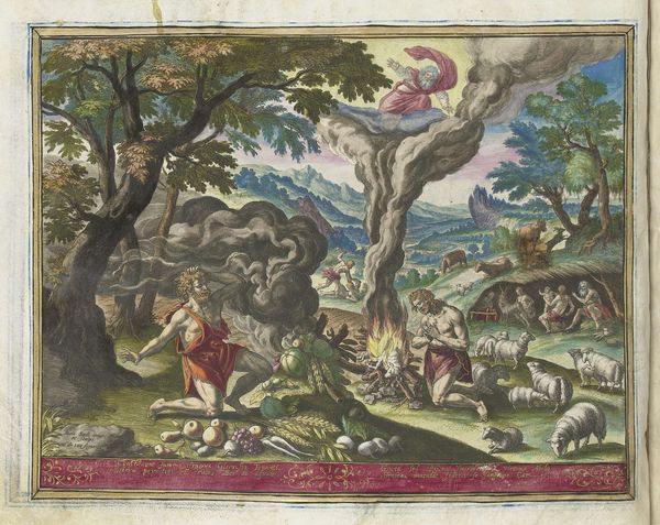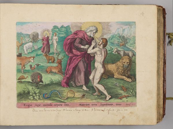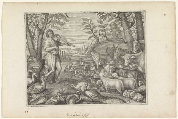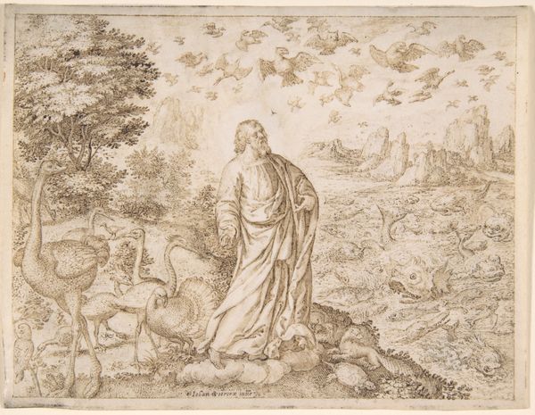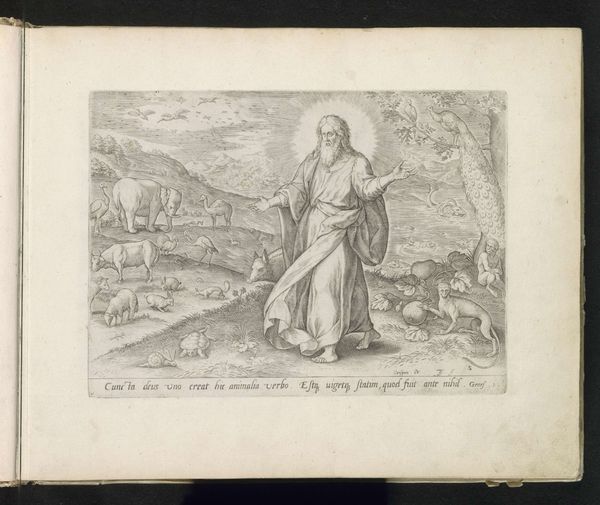Curator: This is Johann Sadeler's "The Creation of the Animals," made around the late 16th century. It’s a detailed engraving, teeming with creatures. Editor: It’s so vibrant! All these animals, rendered with clear attention to line and form. You can almost feel the texture of the paper. Curator: Indeed. This image reflects the period's worldview, situating humanity and nature within a divinely ordained hierarchy and also reinforcing early ideas of animal classifications. Editor: And I’m thinking about the labor involved; the meticulous handwork required to produce such a detailed print, the material reality of its creation. Curator: Exactly, and how that labor is tied to the dissemination of particular religious and philosophical ideas during the Renaissance. Editor: Considering the socio-historical context and the printmaking process, it really invites a more material understanding of the period's beliefs. Curator: Precisely. These visual representations were so important for shaping understandings of the world. Editor: Seeing it this way, makes me appreciate both the artistry, the labor and the cultural context.