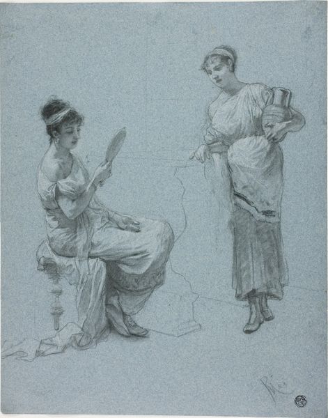 William Edward Frost created this pen and brown ink and watercolor artwork called 'Two Women in Late 18th Century Dress' which now resides at the Art Institute of Chicago. The painting is dominated by a monochromatic palette of blue-gray washes. This imbues the scene with a certain contemplative stillness. The composition features two women, their elegant attire rendered with quick, fluid strokes that emphasize form over detail. The woman on the left is seated, while the other stands, engaging in conversation, her posture suggesting a dynamic presence. Frost’s method of transparent watercolor washes allows light to penetrate and reflect off the paper. This creates an airy quality that softens the rigid formality often associated with portraiture of this era. In its understated and elegant way, the artwork is not just a depiction of period fashion but also an exploration into the artistic possibilities of line, form, and tonal variation. This is made possible by the chosen medium. This reflects an interest in the inherent qualities of his materials, typical of his time.