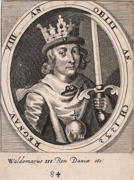 Curator: We’re looking at a print from 1646, titled "Christoffer II." It's an engraving, probably on a metal plate, and is currently held at the SMK, the National Gallery of Denmark. It depicts, as the name suggests, the Danish king, Christopher II. Editor: My first thought is, wow, that crown looks heavy. And is he holding a really skinny sword or like...a letter opener? It’s got that severe formality of the era, but there’s something almost comical about the disproportion of everything. Curator: Yes, that oval format and the dense inscription create a frame around his image that is indeed typical of the period. Remember, portraiture back then served specific symbolic functions. Consider the sword, often representing justice and royal authority—even if it does appear somewhat... miniature here. Editor: Well, symbols often are compacted distillations of larger ideas. Looking at his face, though, he seems burdened, not particularly regal. More like he's doing his duty but wishing he were somewhere else, maybe not wearing that crown! There's an almost… reluctant quality to his expression. Curator: That reluctance, perhaps, tells a larger historical narrative. His reign was tumultuous, marked by internal strife and diminishing royal power. So even in this formal depiction, perhaps we are seeing a reflection of a troubled king, subtly encoded within established iconographic conventions. His eyes, especially, seem downcast and somewhat wary. Editor: Exactly! And even the choice to represent him in what looks like everyday clothing, under the armor, instead of a full ceremonial outfit. Is that about accessibility? I almost feel like he’s speaking to the masses as much as he is to the traditionalists who read all those labels circling his image. There’s an immediacy I don’t typically expect from this era. Curator: That’s astute. Perhaps this choice implies humility or an attempt to identify with his subjects during difficult times. And note the inscription which refers to his reign in Latin and his titles which were important for reinforcing claims to authority and historical legitimacy. Each element acts as a signifier carefully layered with cultural memory. Editor: Fascinating how a seemingly straightforward portrait opens up so many layers. From seemingly wonky composition, to questions of power, to a surprisingly human expression. Art continues to trick me like that; you come for one thing and stay for an entire historical saga. Curator: Precisely, a single image can act as a portal connecting us not only to the aesthetics but the beliefs, anxieties, and power dynamics of a bygone age.
