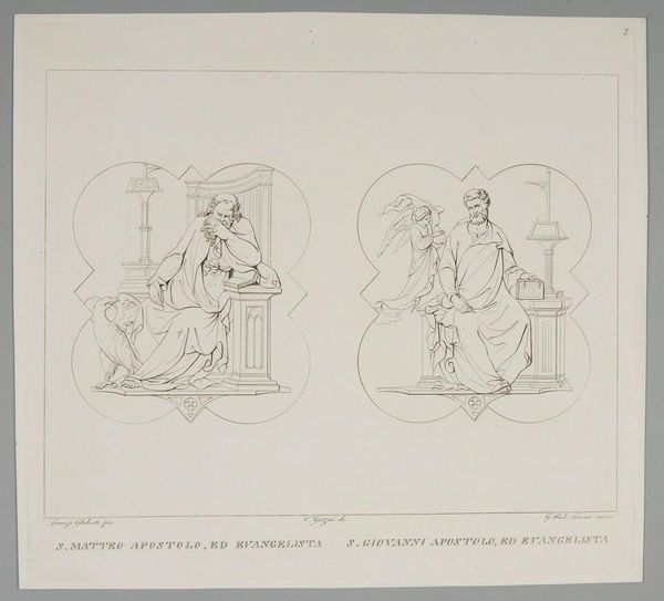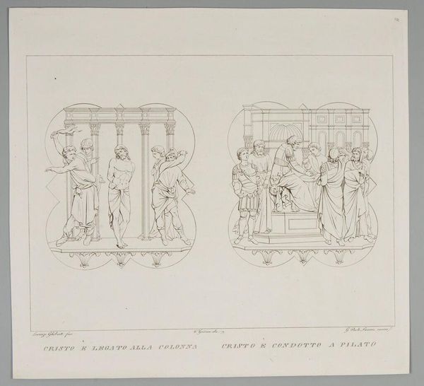Curator: Giovanni Paolo Lasinio's rendering of the North Door of the Baptistery of Florence presents us with a fascinating study in line and form. Editor: It strikes me as a very formal depiction, almost architectural in its precision. I wonder, did he try to capture something about the original artist’s intent, or impress his vision? Curator: Well, the North Door is a celebrated masterpiece. Lasinio likely felt a responsibility to convey its dignity, which is heightened in this depiction of Christ entering Jerusalem and the Last Supper. Editor: You are right, the figures are idealized and somewhat static. The symbols evoke a sense of reverence, but I feel a little detached from any raw emotion or spiritual energy. Curator: Perhaps that distance allows us to appreciate the door’s enduring significance, how these scenes continue to resonate through history. Editor: Yes, it's as if Lasinio is inviting us to contemplate not just the scene, but its place within a larger narrative—of faith, art, and memory.