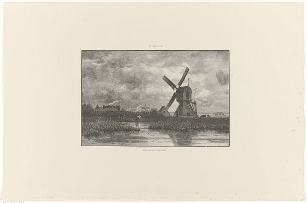 This is "The Fisherman" by Fredericus Jacobus van Rossum du Chattel, a landscape rendered with delicate lines. The composition is dominated by a windmill on the left, a powerful form against the sky. Its reflection shimmers in the water below, creating a sense of depth and doubling that invites contemplation. Du Chattel uses etching to explore the interplay between light and shadow. The subtle tonal variations create a moody atmosphere, with the dark windmill contrasting against the lighter sky. The horizon line is implied rather than defined, suggesting a merging of earth and sky. The scene evokes a sense of stillness, with the fisherman perhaps a lone figure mediating between nature and human activity. It embodies the semiotic tension between the constructed windmill and the natural setting. This reflects a broader discourse on humanity's place within the environment, emphasizing the dialectic between nature and artifice.
