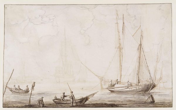 Curator: Look at this, Editor: Simon de Vlieger's "River Scene with Boats," created sometime between 1610 and 1653. It's currently held at the Metropolitan Museum of Art. Editor: My first impression is the artist masterfully conveyed a serene, almost ethereal mood through the delicate strokes and limited color palette of ink. The use of line, weight, and texture defines this sketch. Curator: De Vlieger worked in the Dutch Golden Age. This was a period of immense maritime activity and mercantile expansion, which certainly would have provided rich social context, not just for him, but also other artists too. The subject of boats connects this image to this bigger historical movement. These scenes reflected the Dutch Republic's maritime dominance and expanding global trade. Editor: You make a good point. It’s amazing how he uses linear perspective. The artist directs your eyes through the scene. Curator: The way de Vlieger renders figures offers insights, too. Look at how figures engage with labor or leisure activities along the riverbank. These weren’t just picturesque elements but signified the social realities and economic activities prevalent during that era. How communities interacted with waterways and shaped urban landscapes reveals their power dynamics. Editor: That’s true! But still, for me, it’s also about de Vlieger’s skillful draftsmanship and precise detailing when capturing the forms and textures of the boats and water surfaces. His ability to evoke a sense of depth with varying ink opacities gives volume and visual interest to the whole thing. Curator: Absolutely. But remember, too, in Dutch Golden Age painting, the presentation of river scenes also intersected with cultural ideologies around national identity and economic prosperity, concepts of maritime power, freedom of navigation, and their colonial pursuits overseas. The subjects presented weren’t as simple as we perceive them today. Editor: You are completely right. Well, whatever was behind his intentions, I find his art to be quite pleasant overall. Curator: I agree. De Vlieger offers viewers a multi-layered reflection into cultural norms of that period, encouraging us to delve into the interconnectedness of art, culture, and power in shaping representation of Dutch society during a really pivotal time in its existence.