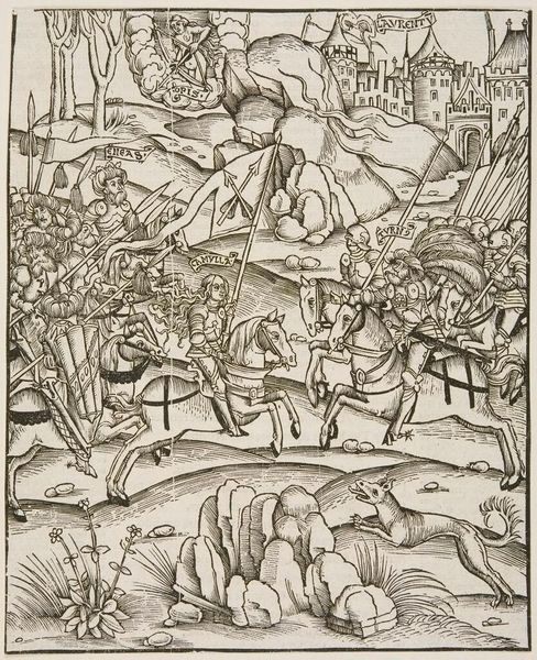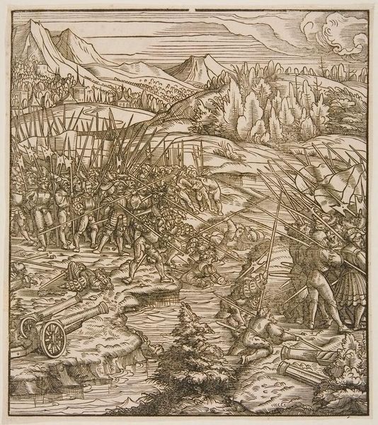 Curator: Here we have an intriguing, though unsigned, woodcut titled "Aeneas's Battles in Latium: Aeneas fights Mezentius and Lausus," currently residing at the Harvard Art Museums. Editor: My first impression is one of chaotic energy, even violence. The stark black and white contrast amplifies the intensity of the battle. Curator: Absolutely. The image depicts a scene from Virgil's "Aeneid," showcasing Aeneas locked in combat. Mezentius is the Etruscan king, and Lausus, his son. It is interesting how they are presented here. Editor: The depiction of Aeneas as a triumphant hero feels almost…formulaic. But look at Mezentius, his shield adorned with symbolic charges, perhaps representing his lineage or attributes? What does the artist want us to read into that visual information? Curator: It’s difficult to say definitively. The lack of shading and the somewhat stiff figures create a sense of flattened space. This could be intentional to focus on the symbolic weight of the figures. Editor: Indeed, there's a powerful narrative condensed in this small print. Makes you think about how these stories of power and leadership still resonate. Curator: Precisely. A fascinating glimpse into how classical narratives were interpreted and disseminated.