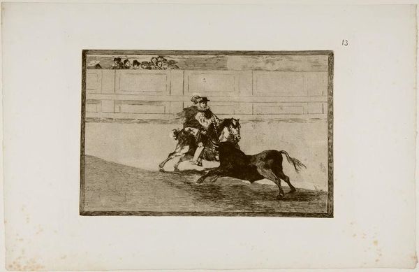 Curator: This print, titled "Stierenvechter in een arena", was completed by Francisco de Goya in 1876. The piece currently resides in the Rijksmuseum, it's rendered as etching and embodies a landscape orientation. What's your immediate impression? Editor: It's immediately visceral. The drama of the bullfight is palpable, and even in this small scale, Goya conveys the intense energy and almost primitive dance between man and beast. Curator: Precisely. The composition utilizes a dynamic interplay of light and shadow, almost as if constructed in zones across the arena’s flattened space. Goya masterfully uses the etching technique to suggest volume, motion, and depth through varying densities of lines. Editor: Thinking about materiality, the etching process itself—the biting of the acid into the metal plate, the labor of pulling each print—feels analogous to the violent engagement in the bullring. Each impression is a testament to a harsh physical process mirroring the arena's violence, creating multiples for wider consumption. Curator: Interesting parallel. I would simply draw attention to the way Goya abstracts certain forms while elaborating others to guide the eye toward the primary subject, that charged point of intersection. It’s about the spatial arrangement and rhythmic ordering. Editor: The setting also emphasizes a social framework: the spectators forming an implied context that’s equally important in creating this narrative. You’ve got the consumption of sport in both production of print and ritualistic social setting of a bullfight. Curator: One could argue that it critiques rather than celebrates the spectacle. But it is Goya’s control over form and perspective—its radical design that really commands our reading of it. Editor: I suppose my materialism sees even the formal choices themselves embedded within their cultural and material conditions, right? From labor to viewing patterns—this print invites many entry points into his work. Curator: Ultimately, it prompts contemplation of technique and its effects and invites diverse critical interpretations depending on the framework of the viewer. Editor: A print of enduring cultural power and material interest—thanks to Goya's compelling engagement with a particular time, culture, and tradition.