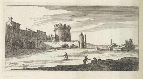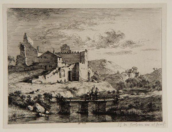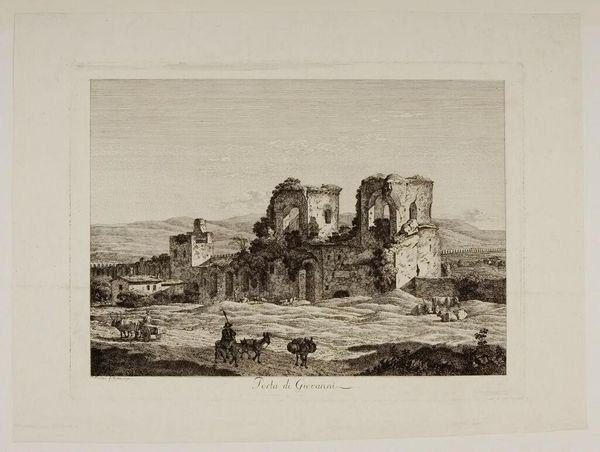 Editor: This is Jacob Wilhelm Mechau's "Porta di Giovanni," an etching, I believe. It depicts a decaying gate. What strikes me is how the architectural ruins are integrated into the landscape. What production processes might have led to this integration? Curator: Focus on the etching itself. The labor involved in creating this image – the artist's hand, the acid biting into the metal, the press transferring the image – speaks to a specific mode of production. How does the consumption of such images reflect the social context? Editor: So, you are saying the printmaking production provides commentary on social contexts of that time? Curator: Precisely. The etching’s accessibility contrasts with the monumental architecture it portrays. Consider how the print serves as both a record and a commodity, shaping perceptions of history and place. What do you make of that? Editor: That the printmaking democratized art viewing, but also turned historic sites into commodities. Curator: Exactly! A fascinating tension, isn't it?