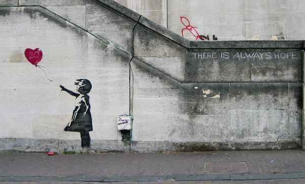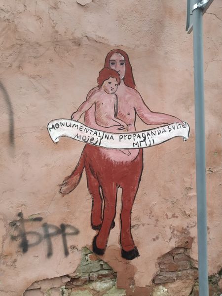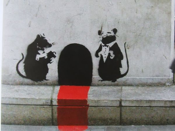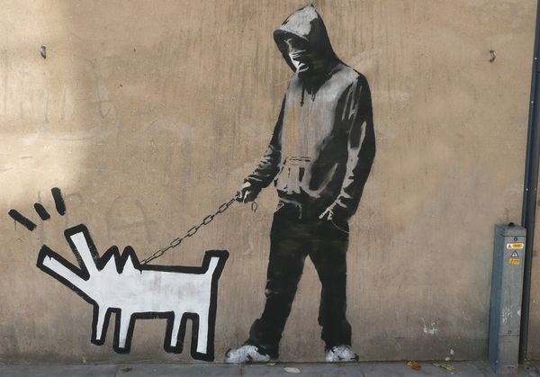 Here we see a stencil by Miss.Tic, whose date is unknown, on what appears to be an urban wooden support. The immediate visual impact arises from the stark contrast of black silhouettes against a weathered background marked by graffiti. Miss.Tic uses the human figure—specifically, the interaction between a man and a woman—to explore themes of power and gender relations. The man is presented as a headless suit, which is an absence that strips him of identity, reducing him to a symbol of authority. The woman is looking at the man's crotch with an ambiguous gaze, perhaps examining or appraising. The phrase “No Comment”, painted in a simple, almost naive style, adds a layer of semiotic complexity. The artwork avoids prescribing a singular interpretation, instead inviting viewers to question the power dynamics suggested by the arrangement of figures and text.