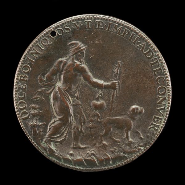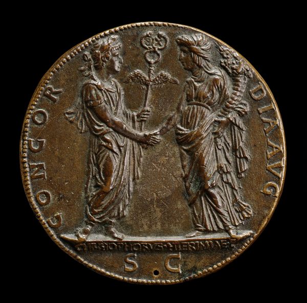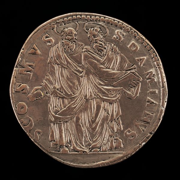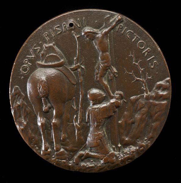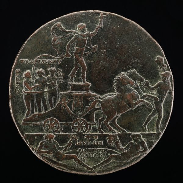 Curator: At first glance, the density of figures within this circular frame is striking, almost claustrophobic. Editor: We are observing a bronze relief by Cristoforo di Geremia from around 1458, titled "Alfonso Crowned by Mars and Bellona." It presents an intriguing snapshot into the self-fashioning of Renaissance power. Curator: Indeed. The composition is remarkable. We see Alfonso enthroned, being crowned by what appear to be allegorical figures of Mars and Bellona. Note how their muscularity contrasts with Alfonso's more restrained pose, the way all figures are facing front to underscore monumentality and how their dynamism leads the eye towards the main inscription at the upper perimeter of the circular medium, creating a halo of legitimacy. Editor: Precisely! These weren’t merely portraits; they were deliberate constructions of authority. Alfonso of Aragon sought to legitimize his rule in Naples through strategic visual propaganda. Casting himself amidst these classical figures signaled a connection to the glories of the Roman Empire and framed his military conquests, here represented through Mars and Bellona, as divinely ordained. Note, also, the diminutive figure kneeling below—a conquered foe? Curator: Likely. This element underscores Alfonso’s power through contrast, employing the conquered body to enhance Alfonso' victorious presence and dominance. Editor: And the materiality matters, too. Bronze, associated with strength and permanence, lends further gravitas to the message. Creating this portrait on the medium of a medal enables to circulate the image in order to spread the ideological statement across geographical areas. Curator: Consider how the texture further accentuates the details, the smoothness of Alfonso's face against the rougher drapery, or the defined musculature of the gods. Editor: It is truly an effective intersection of art and power. I'm struck by the artist's skillful use of historical and mythical figures to build a carefully crafted persona. Curator: I find myself lingering on how its design invites close visual analysis, how semiotics are layered to amplify ideological meaning, a compelling example of artistic rhetoric.