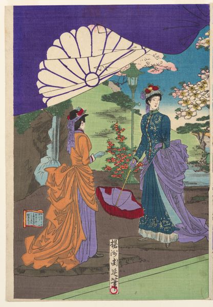 Editor: Here we have "Chrysanthemums at Court" by Yoshu Chikanobu. It's a print on paper. The details in the clothing and the carpet are striking, but the composition seems a bit unusual to me. What do you see in this piece? Curator: The visual construction is quite intentional. Note the interplay of textures and patterns—the chrysanthemums themselves against the ornate dresses, further contrasted by the rigid lines of the architecture. Editor: So, the contrast creates the meaning? Curator: Precisely. The formal elements converge to create a visual dialogue between nature, society, and the individual. It's a study in visual relationships. Editor: I never thought about it that way. Thanks! Curator: A fresh perspective always enriches the experience.