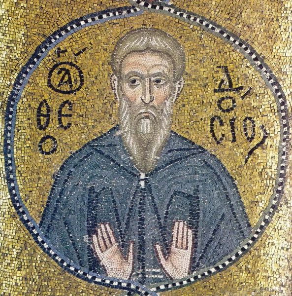 Curator: The figure of The Apostle Paul, a mosaic shimmering from the Saint Sophia Cathedral in Kyiv, Ukraine, circa 1030. Editor: My goodness, that halo just pops! All that radiating gold...it's mesmerizing. Makes him feel very…elevated, you know? Curator: That intense radiance is partly achieved by setting the tesserae, the individual mosaic pieces, at angles to catch and reflect the light. And you're right, there is a symbolic heightening at play here, declaring Paul's saintly status. Look at the book in his hand. Editor: Intricate. And heavy with meaning, I presume? Is that his Gospel? Curator: Indeed. The Apostle is holding a Gospel. Red, in this case, can be interpreted as divine love, passion, and sacrifice. See the geometry? Notice how that decorative patterning both contains and radiates power... Editor: Almost like a jewel... but not cold. More like a source of heat. Speaking of patterns, it strikes me how even in such a defined religious context, you find this organic quality. Like looking at sand after the tide’s gone out, you can see where the divine hand smoothed things out with a sort of perfect imperfection. Curator: Yes! It’s so important to recognize how Byzantine art creates visual and conceptual balance, reflecting a cosmic order and communicating power, but also deep humility. I think that is particularly evident in the downward glance that lends the apostle such solemnity. Editor: That subtle downturn, yes...almost like he’s weary with knowledge. Burdened, perhaps, by the weight of it all. But not broken. Far from it. There is profound, even magnetic strength embedded into this face. I almost wish I knew more about Paul, to better unpack what all these symbolic components are hinting at. Curator: Exactly! Byzantine art does just that, creating a spiritual invitation that transcends time. Editor: So here we stand, centuries later, still being provoked, and maybe even transformed a bit, by these meticulously laid tiles and artistic decisions! Curator: Right you are. It serves as an important reminder of the enduring human search for the sacred, a quest constantly expressed through image and symbol.