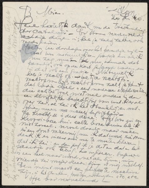 Editor: We're looking at a drawing entitled "Brief aan Mien Cambier van Nooten," thought to be from 1937-1939 by Dick Ket. It's ink on paper and from the Rijksmuseum collection. What immediately strikes me is the density of the writing. It feels very intimate, almost like we are intruding on a private conversation. What can you tell me about it? Curator: Well, you’ve already touched upon some key aspects. Think about the social context of letter writing at this time. It wasn’t just about relaying information; it was a deeply performative act, solidifying social bonds and hierarchies. Given Ket's biography, and the constraints he faced due to his health, correspondence held particular weight. How might his physical limitations shape not just the *content* of the letter, but the visual presentation itself? Editor: That's interesting. I hadn't considered the connection to his physical state. So, his health would restrict social interactions? Curator: Exactly. The letter, with its cramped but beautiful script, becomes almost a proxy for personal interaction, a way to maintain his place within a social sphere from which he was often excluded. We also have to consider Ket’s position within the art world itself; letters were vital to maintain contacts, engage in debates, secure patronage… Where might this specific letter fit into that framework? Editor: Perhaps it was also a way to construct and project an ideal version of himself, beyond his physical limitations? Curator: Precisely! So, it’s more than just the *words* he's using; it’s about how he crafts an identity through the very act of writing, for both his intended reader and, perhaps, a future audience like us. Editor: I hadn't thought about letters in such a performative way. Curator: That's often the power of revisiting seemingly straightforward historical materials – they often reveal complex negotiations of self and society.