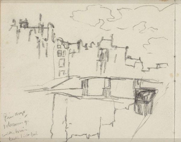 This sketch of a view in Amsterdam, possibly the Beurspleintje during demolition, was created by George Hendrik Breitner. The entire composition is rendered in graphite on paper, emphasizing line and tonal value over color. What strikes you first is the structural geometry of the buildings. Notice how Breitner uses hatching to define the angular planes, giving the impression of a city in flux, caught between construction and deconstruction. The sketch employs a semiotic system, where architectural forms serve as signs of urban transformation. The crumbling facades and skeletal structures evoke a sense of instability. Breitner's application of line isn't merely descriptive; it's also expressive. Thick, dark lines suggest weight and mass, while lighter, fainter strokes imply distance and transience. This interplay challenges fixed notions of permanence, and offers a commentary on the ephemeral nature of urban existence. The demolition site, captured with raw immediacy, becomes a canvas for interpreting broader philosophical themes about the ceaseless cycle of creation and destruction.