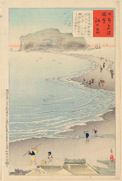 Curator: Utagawa Hiroshige's "Seven League Beach, Sagami Province" is a striking woodblock print, part of his famous "Thirty-Six Views of Mount Fuji" series. Editor: It has a wonderfully serene quality. The lines of the waves are so elegantly rendered, and Mount Fuji provides a strong focal point. Curator: Hiroshige created this series during a time of increased domestic travel in Japan, thanks to improved infrastructure. Prints like these fueled a national fascination with landscapes. Editor: Absolutely, the linear perspective draws the eye deep into the composition, guiding it from the foreground figures, along the shore, and eventually to the iconic mountain. Curator: Indeed. It's interesting to consider how this print, alongside others in the series, shaped the very idea of "Japan" in the popular imagination of the time. Editor: Well, I'm simply captivated by the interplay between the detailed foreground and the distant, almost ethereal, presence of Mount Fuji. A great example of balance.