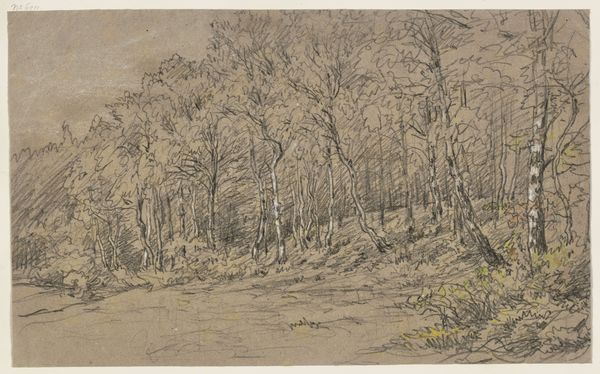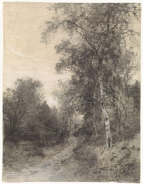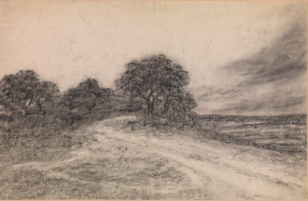 Henri-Joseph Harpignies made this monochrome painting on paper, and it looks like he was really feeling the landscape that day. The cool thing about a piece like this is how the material itself sort of *becomes* the subject. It's all washes of ink and thin paint, blurring the distinction between earth, foliage and sky; the road is almost a continuation of the sky, just a lighter patch in the lower left corner. Look at how he's using the paper, letting the white peek through to create highlights and texture. See how the trees are like dark, gestural marks, kinda like calligraphy? What's wild is that, even with such a limited palette, Harpignies captures the *feeling* of a place. It's not just about what it *looks* like but how it *feels* to be there, in that moment. It reminds me a bit of Corot, with that hazy, dreamlike quality, that sense of being lost in nature. It's like a whispered secret between the artist and the landscape.