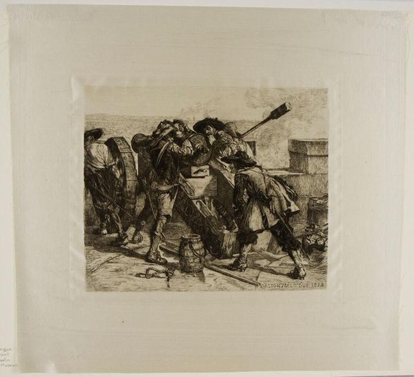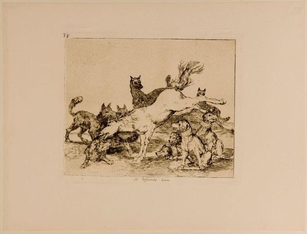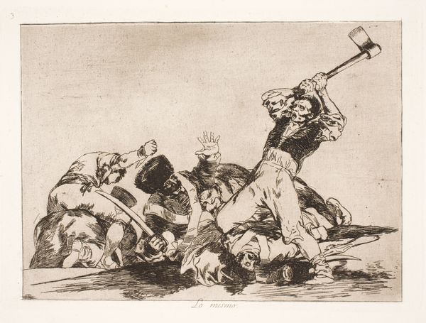 Editor: Here we have Goya's print, "The Same," currently held at the Harvard Art Museums. Its raw energy is unmistakable, conveyed through stark contrasts. What do you make of this composition? Curator: The dynamism is certainly arresting. Notice the figure wielding the hammer; its placement creates a strong diagonal that bisects the scene, heightening the sense of violent action. Consider the use of aquatint to create tonal variations—how does it contribute to the overall impact? Editor: It definitely adds to the drama, almost like a spotlight on the conflict. The clustered figures seem to push against the light. Curator: Precisely. The limited palette forces us to focus on form and the expressive potential of line. This etching reveals Goya's mastery of conveying psychological intensity through purely visual means. Editor: I see that now. I really appreciate how you broke down the visual components.