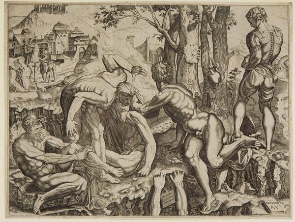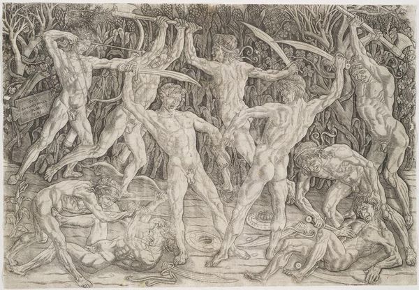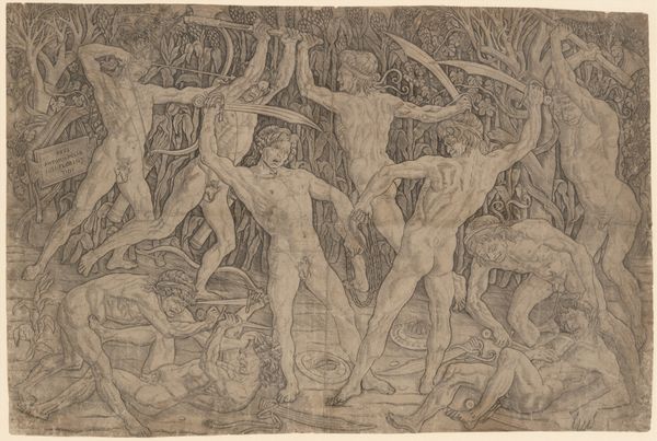Editor: This is George Bellows' "The Barricade, No. 2," a stark black and white print. It looks incredibly tense and brutal. What do you see in this piece? Curator: Bellows created this work without a specific date, but it undoubtedly speaks to the visual and cultural impact of war. Do you see how the composition pits vulnerable, nude figures against armed soldiers? Editor: Yes, it feels like a power imbalance, almost a dehumanization. Curator: Precisely. Consider the historical context. Bellows made several anti-war works. How might this image function as a form of social commentary? Editor: It’s a very powerful indictment of violence and the abuse of power. I hadn't considered that aspect fully before. Curator: Art can be a powerful witness.