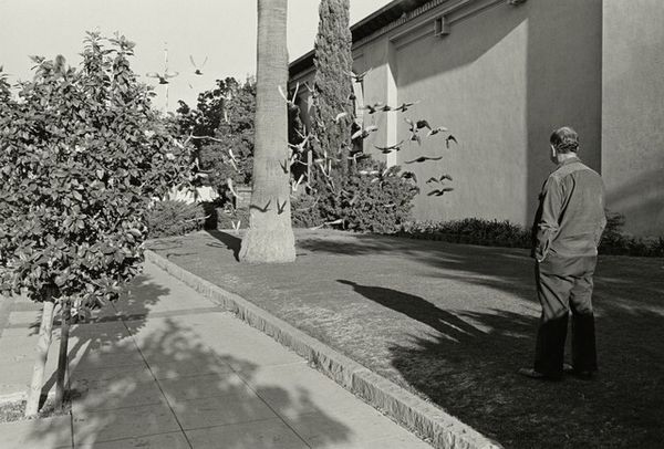 Editor: Here we have Bill Dane’s black and white photograph, "Untitled (Marine World)." I’m immediately struck by the unexpected juxtaposition of figures. What’s your take on this, especially considering the artist's process? Curator: I see a fascinating record of labor, performance, and the everyday. The choice of black and white, the seemingly casual composition – these are deliberate acts challenging traditional photographic practices. How does the readily available material of the t-shirt inform the work's meaning? Editor: Perhaps it highlights the fleeting, performative nature of identity, accessible to everyone. Curator: Precisely. Dane transforms ordinary materials and actions into commentary on social behavior and photographic representation itself. Something to consider, even now. Editor: I never thought of it that way, the mundane becomes the message.