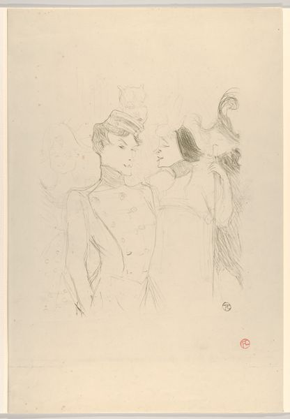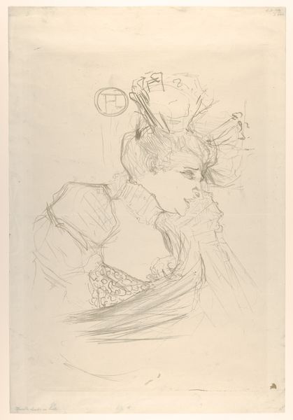 Editor: Here we have Henri de Toulouse-Lautrec’s "Mlle. Lender in 'Madame Satan,'" from 1894, a pencil drawing and print. It feels almost ephemeral, like a memory sketched onto paper. The lines are so light. What's your take on this wispy portrait? Curator: Ah, Lautrec. He always makes me think of late nights and absinthe dreams, you know? What captures my eye here is how he uses line – just a few strokes to convey so much character, almost as if he's drawing with light itself. Do you get a sense of the energy of the music hall, the performer bathed in spotlights? It’s as though he wants us to glimpse her not just as she *is*, but as the spectacle she *creates*. Editor: Definitely! It feels so transient, capturing a moment in time. There is something very informal about it. It makes you wonder what they were saying. Curator: Precisely! Lautrec understood that art wasn’t just about what you see, but about what you *feel*, what vibrates in the air between the subject and the artist – and then, later, between the art and the viewer. He wants us to imagine the before and after of this split second, you see? Editor: That's so interesting! I'd never considered how much a 'simple' sketch could evoke a whole world. It’s more than just a likeness. Curator: Exactly. He wants us to connect with Mlle. Lender beyond her role as a performer. We have become accomplices to that split second. I think it also hints at something more broadly in culture at the time - an infatuation with modern celebrities and their persona. What do you think of that idea? Editor: Absolutely, like we're backstage catching her in a moment of reprieve before her show. I'll certainly look at sketches differently now, as windows into an imagined narrative, thank you! Curator: My pleasure, it’s these whispered secrets that art seems to carry that make them so special to behold.