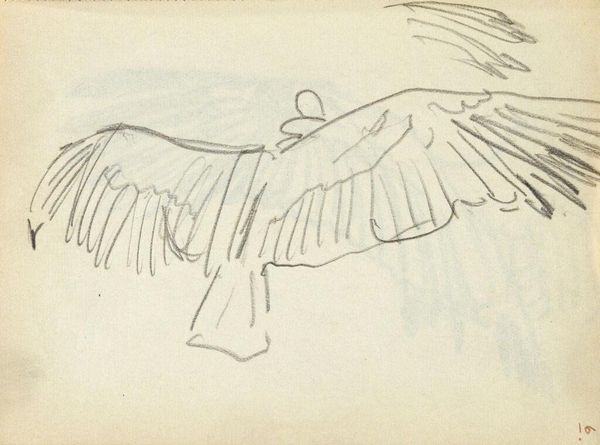 Curator: Here we have John Singer Sargent’s, "Study of a Vulture with Wings Spread," a small but striking drawing. It resides here at the Harvard Art Museums. Editor: It's hauntingly beautiful, isn't it? The stark simplicity of the graphite on paper, the monumental scale of the wing given its diminutive size--it speaks of vulnerability and potential. Curator: Vultures, often seen as symbols of death and decay, also represent cleansing and renewal. It is interesting that Sargent, known for his portraits of high society, chose this subject. Editor: Perhaps Sargent saw past the surface, glimpsing the transformative power inherent in the vulture's role. The wing itself is a potent symbol of freedom and escape. This sketch, stripped bare, feels raw and very personal. Curator: I agree. It's a reminder that even the most unconventional subjects can reveal profound truths. Editor: Exactly! This is a potent image that captures our imagination.