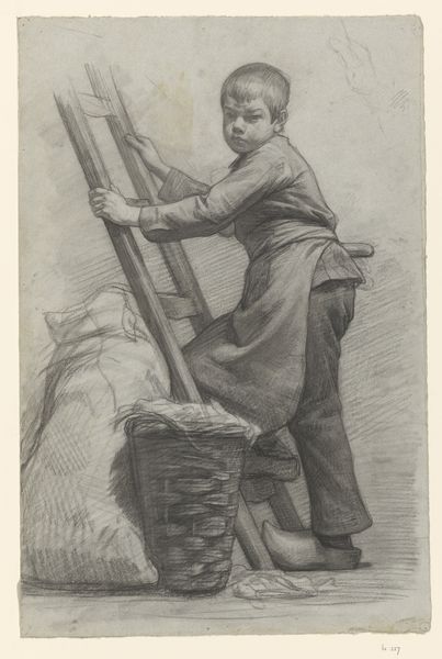 Curator: This drawing is called "Arbeider die een kruiwagen omkeert," or "Worker Tipping a Wheelbarrow," attributed to Pieter de Josselin de Jong, sometime between 1871 and 1906. It’s done with pencil on paper and currently resides in the Rijksmuseum collection. Editor: It's immediately striking – so raw and full of movement. The composition centers on a powerful figure caught in action. The stark contrasts of light and shadow heighten the sense of weight and exertion. Curator: Yes, the portrayal of labor, especially in the late 19th and early 20th centuries, speaks to the rise of industrialization and the changing roles of the working class. Wheelbarrows are, of course, incredibly symbolic. The implement of progress, the humble conveyance… What else does this piece communicate to you? Editor: Well, focusing on the intrinsic elements, look at the varied line weights! There's this incredibly deft handling of shading that gives a palpable texture to the worker's clothes and the rough, almost crumbling form of the wheelbarrow itself. And how the sketchy lines around the central image imply that it is from a series of explorations. The artist clearly wasn't aiming for perfection. Curator: Exactly! These quick, almost impulsive sketches are the silent record of those most often unseen, performing manual labor and contributing so meaningfully to a shifting economic landscape. You mentioned crumbling – this communicates themes of entropy as much as industriousness. Notice how the figure appears to be struggling? The act of overturning that barrow takes monumental effort. Editor: That reminds me – I wonder if the worker himself realizes he's part of this monumental societal shift you're describing. To him, it’s perhaps a job, but on another level, we see in it a universal symbol for resilience in the face of burden. Curator: A fascinating paradox – both document and symbol! I agree that de Josselin de Jong has presented to us a glimpse into not just a historical period, but the shared human condition that is timeless in our emotional understanding. Editor: It truly shows how effective simple lines, tones, and suggestive marks can conjure complex themes and the many faces of "progress" in art and life.