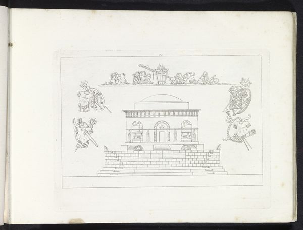 Curator: This intricate drawing, rendered in ink on paper, is entitled "Twee tempels en Ceres op een rijtuig dat wordt voortgetrokken door twee draken"—or, in English, "Two Temples and Ceres on a Carriage Pulled by Two Dragons." It's attributed to Pietro Ruga and dates to 1817. What stands out to you at first glance? Editor: A sense of ethereal geometry. Everything feels precise and carefully placed, yet the light linework almost makes the temples seem as though they could fade away. And that chariot pulled by dragons above—there's a delightful tension between the solidity of architecture and the airy dynamism of the mythological scene. Curator: Yes, the placement does orchestrate an interesting dialogue, doesn't it? Let's start with Ceres, the Roman goddess of agriculture, fertility, and motherhood. Consider the implications of framing her centrally. What does that symbolize to you? Editor: Framing her as the figure soaring in the heavens above these temples immediately establishes power—legitimacy and an inherited divine right to shape worldly power structures. Given Ceres' association with abundance and the earth, this evokes both prosperity and possibly questions about access and control in her name. Curator: The artist adheres to the stylistic precepts of neoclassicism—notice the clarity of form, the emphasis on order, the invocation of Greco-Roman antiquity through geometric design. The temples are stark and monumental. However, I wonder what narratives they’re meant to symbolize beyond civic or imperial power? Editor: Right. And perhaps it's worth asking what "fertility" meant in the period context, and for whom? Temples were not spaces of open access for all, and even as sacred places, deeply mirrored the inequities of social access according to race, class, and gender. The symbols present may obscure very painful political realities and the violence inherent in maintaining those "classical" hierarchies. Curator: That intersectional understanding definitely complicates our view and makes a case for approaching the artist’s intention as more than just an expression of formal appreciation. The figure of Ceres drawn almost like a shadow figure hovering ethereally—do you think this visual element creates tension or promotes a theme, especially knowing this drawing surfaced around 1817? Editor: Perhaps Ruga attempts to remind viewers that perceived stability is a fiction. Despite our wishes, even the most powerful mythic figure and geometric edifices float across an uncertain terrain. The artist prompts us to engage critically with those notions of “grand narratives” presented and implied, if that reading holds up? Curator: Interesting perspective. I was focused more on the iconography, but you've really brought out the broader cultural context. It demonstrates, yet again, how a deeper reading can yield multiple, fascinating layers to otherwise rigid artwork. Editor: Indeed, and that tension is what ultimately keeps drawing me back in for further interrogation!