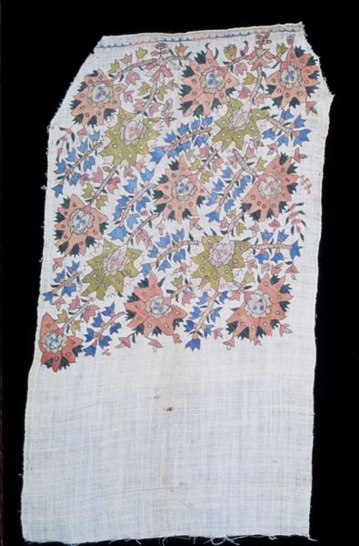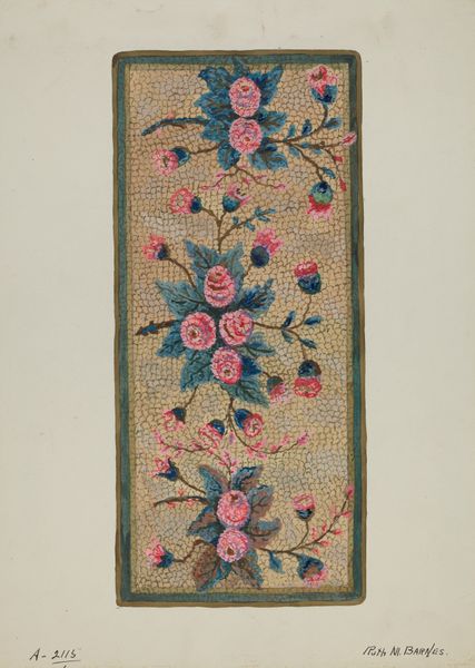 Editor: Here we have "Sash," a fibre-art piece created in the 19th century by an anonymous artist. It’s currently held at the Art Institute of Chicago. The weaving is detailed and lovely but evokes a sense of fragility with its muted palette and thin material. What visual memories does this piece evoke for you? Curator: It’s interesting that you use the term fragility. To me, it speaks more to resilience, considering how textiles function as both art and everyday objects, particularly in cultural memory. The symmetric patterns remind me of stylized renderings of gardens, almost Edenic, suggesting a paradise, rendered permanent by thread. Look closely— what symbolic plants or objects repeat? Editor: I see what might be stylized tulips, and maybe tiny buildings resembling small chapels nestled amongst the foliage. Is this a common motif? Curator: Gardens as earthly paradises were extremely popular in 19th-century art and decoration. However, the chapels or architectural structures nestled amongst the blooms seem distinct. It suggests more than just an aesthetic appreciation; it is referencing beliefs or personal narratives intertwined with place and devotion. Do you sense any other meanings imbued within these patterns? Editor: I hadn’t thought about the buildings as more than decorative, but the repetition does suggest a story. Perhaps they represent personal landmarks, woven into a vision of an ideal world. The sash format might reference some honor or ritual. Curator: Exactly. Textiles often transcend mere function; they carry deeply embedded cultural and personal meanings. Examining it has refreshed my view of how personal experiences imprint onto tradition. Editor: I now recognize that this sash holds so much more significance, beyond just being visually pleasing. Seeing art this way deepens my appreciation.