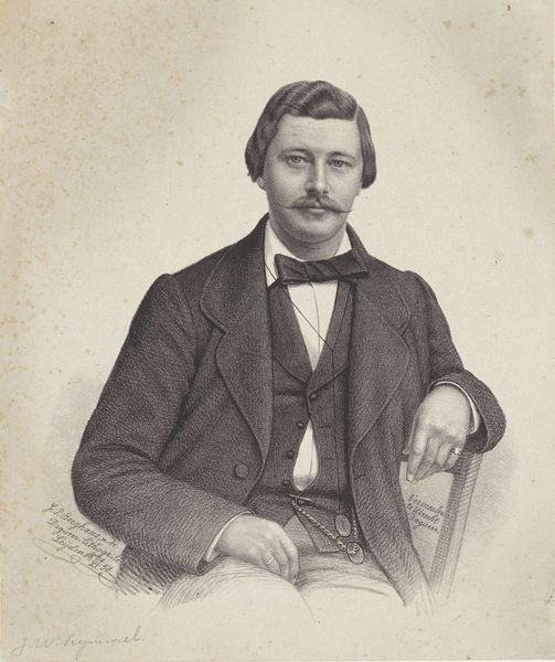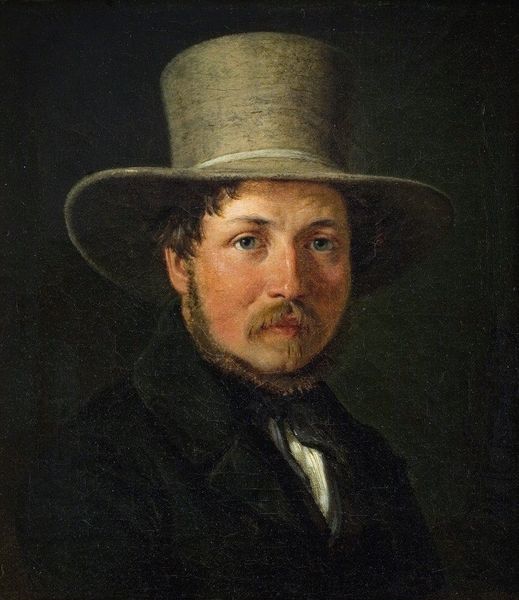 Józef Simmler painted this portrait of Teofil Lenartowicz, a poet and sculptor, using oil on canvas. The composition is dominated by a dark palette, setting a somber mood, yet the subject’s face is rendered with a soft light, drawing our eye to his gaze. Simmler uses the sitter's tools, a pipe and stylus, to indicate Lenartowicz’s creativity, yet the objects are muted, blending into the dark background. A ghostly bust lurks in the shadows behind the sitter, perhaps alluding to a work in progress. The materiality of the paint itself is crucial here. The texture varies from the smooth, almost porcelain-like finish of the face, to the rougher, more visible brushstrokes of the background. This contrast isn't just stylistic, but serves to emphasize the intellectual and artistic nature of the sitter. The portrait is not just a likeness, but also a statement on the creative process.