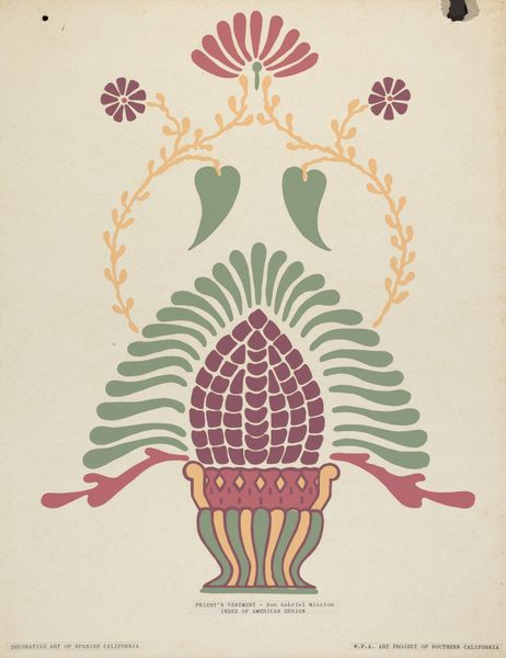 This print, made by an anonymous artist for the WPA Art Project of Southern California, showcases the decorative arts of Spanish California. The silkscreen technique employed here – a relatively new method at the time – allowed for vibrant, flat colors and crisp lines, ideal for capturing the essence of textile design. Notice the stylized paisley motif, a popular pattern with origins in Persia, cleverly adapted to a Californian aesthetic. The choice of colors, soft blues and yellows, is also significant, evoking the landscape of the region. Silkscreen, or serigraphy, is a stencil-based printing process that relies on pushing ink through a mesh onto a surface. This print is more than just a reproduction; it's a record of design, labor, and cultural exchange. It reminds us of the skilled craftsmanship of the original textile artisans, while also speaking to the industrialized methods of image production that were gaining momentum in the 20th century. By focusing on the materials and techniques used, we gain a richer appreciation for the social and cultural significance embedded within this seemingly simple design.