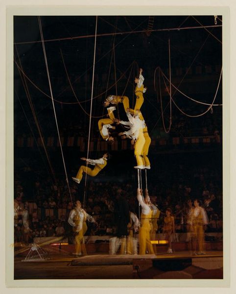 Curator: This photograph, simply titled "Untitled (L. A.)," was taken by Bill Dane, an American photographer born in 1938. The black and white image captures a scene from what appears to be a circus performance. Editor: The image feels heavy somehow. There's so much detail crammed into the frame, between the audience and the rigging, it’s overwhelming. The spectacle seems to press down. Curator: Circuses are fascinating cultural phenomena, aren't they? This photograph serves as a record of a certain kind of popular entertainment, showcasing the theatricality and even the tension between human skill and animal performance. Editor: Yes, and note how the photograph immortalizes that tension, freezing a fleeting moment of entertainment into something timeless. Elephants have long been symbols of memory and wisdom, yet here they are, costumed and performing. It’s unsettling. Curator: I agree. Considering the photograph’s creation, it provides an invaluable record of a cultural event, preserved for study and reflection. Editor: Absolutely. It forces us to consider not just the performance, but the complex historical, social, and ethical implications of such displays.