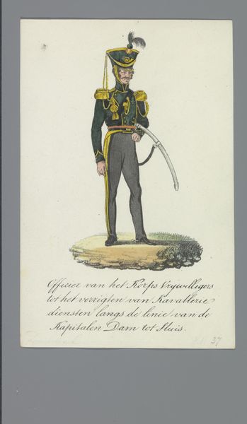 Curator: Here at the Rijksmuseum, we're looking at "Trumpeter of the Volunteer Corps for Cavalry Service Along the Capital Line from Dam to Sluis," a watercolor created between 1835 and 1850 by Albertus Verhoesen. Editor: My initial sense is, dare I say, somewhat theatrical. The trumpeter, almost like a figurine, is set upon this miniature grassy mound as if he’s about to deliver a very important pronouncement. Or maybe star in a pastry commercial. Curator: It’s fascinating how Verhoesen uses line and color to define the figure. Observe the precise rendering of the uniform; the clean delineation of its various components highlights not only social identity but also the individual’s place within a very particular structure of authority. Semiotically, each aspect reinforces a certain hierarchical relationship. Editor: It does! His pose is both erect and relaxed; it feels like he's about to break into song at any moment. The tiny glints of gold and silver accents amplify that drama further, almost suggesting he's posing rather than in action. It seems odd; did trumpeters pose for painters often? I suppose genre painting can encompass staged portraiture sometimes. Curator: Given the work's possible function as a form of Romantic-era genre painting, we should acknowledge that the details presented, in their deliberate arrangement, reflect that very function—the creation of idealized narratives of identity. So the slightly affected pose fits that representational strategy perfectly, in that it creates an emblem for larger patriotic sentiments. Editor: I appreciate how the artist plays with the formal constraints while conjuring this somewhat odd effect that still hints at some degree of spontaneity within its genre. Even if it's staged, Verhoesen has created a miniature scene of something vivid out of something inherently constructed and artificial. It has charm, in a small-scale format. Curator: A fitting evaluation. The strategic deployment of aesthetic and stylistic elements invites the viewer to not just perceive, but analyze. Editor: Yes, which makes you wonder... if we only had horses instead of the mound he's posing on? Now, THAT would add a flourish! But perhaps that would require a longer investigation. Thanks for guiding the way.