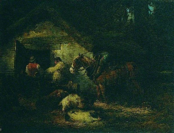 Editor: We are looking at Isaac van Ostade's "Farmhouse Interior" from 1642, executed in oil paint. The composition is quite striking; the dramatic contrast of light and shadow immediately creates a somewhat gloomy atmosphere. What aspects of the painting stand out to you from a Formalist perspective? Curator: The artist masterfully orchestrates a visual dialogue between light and darkness. Note how the composition adheres to the classical, almost architectural organization of forms, carefully balanced in their distribution across the picture plane. The textures too command attention; Ostade coaxes such varied qualities from oil paint: consider the rough, tactile rendition of the wooden beams, contrasting with the subtle luminosity emanating from the doorway. Editor: I see that. The texture really gives it a sense of realism despite the obviously staged composition with the darkness framing the light. But isn't realism a bit contrary to formalist ideals? Curator: The degree to which the artwork succeeds as realism is of lesser importance to formalism than how skillfully Ostade balances color and tone across the plane. Are there certain formal strategies visible at the center of the image that appear more successful to your eye? Editor: Now that you mention it, the gradient from shadow to light looks almost like two separate images merged together. One uses muted earth tones, and the other one utilizes almost neon shades of white and yellow. I wonder if he did that intentionally to create two points of perspective? Curator: Precisely. The interplay transcends mere representation. It serves an internal formal logic – that the shapes relate less to real-world equivalents, and more to an underlying formal grid. A structure to the work. It is that tension itself that generates pictorial interest. Editor: It is fascinating how a formalist reading reframes what I thought was a somewhat dull landscape painting! I will definitely think more about the formal qualities in artwork now.