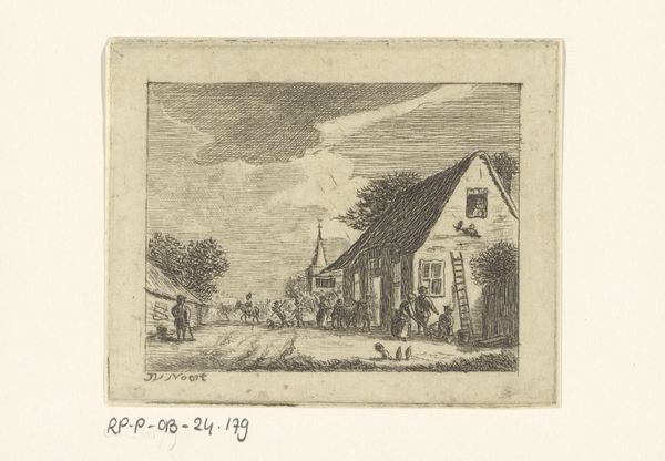 Editor: Here we have Eberhard Cornelis Rahms's "Gezicht op Hekendorp" from 1863, executed as an etching. It has an intimate, almost nostalgic feel to me. The textures created by the etching are captivating. How do you read the composition and form in this work? Curator: The formal structure presents a fascinating study in contrasts. Note how Rahms uses line to create a sense of depth, guiding the eye from the foreground cottage to the distant windmill. Observe also the juxtaposition of textures: the rough, almost chaotic hatching of the foliage against the smoother planes of the buildings. It is in these contrasts that the work achieves its visual tension. Editor: That's interesting! I hadn't focused on that specific push and pull. So, what does the limited tonal range contribute? Curator: Precisely, the monochromatic palette emphasizes form and texture, reducing the scene to its essential components. The interplay of light and shadow becomes paramount. The areas of darker hatching create a sense of weight and solidity, while the lighter areas suggest a softening atmosphere. Editor: So it is the form itself creating the affect! I was reading the scene as serene but perhaps there is turmoil lurking underneath. Curator: Indeed. Through a focused attention to form, Rahms's work invites contemplation not of an idyllic countryside alone, but of the formal possibilities inherent within the etching itself. Did you notice that the upper space in the piece provides an odd feeling, almost like an absence, inviting closer inspection of foreground elements? Editor: I see it now. Thank you for highlighting the compositional strategy and technical execution! Now I notice details that went right over my head initially. Curator: My pleasure. Hopefully you'll consider structure in the future.