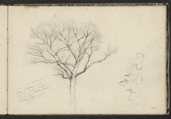Editor: So this is "A Path Among Trees with a Standing Man and a Detached Umbrella" by P.C. Skovgaard, a pencil drawing from 1872. There's almost a feeling of spontaneity and it has some impressionistic elements. It feels more like a preliminary sketch. How do you see this drawing, especially thinking about its time? Curator: Well, what strikes me is the casual nature of the piece juxtaposed against the broader trends of Danish art at that time. Skovgaard was part of the "Golden Age" of Danish painting, but this doesn't quite have the epic, nationalistic feel we often associate with that era. It's much more intimate. Editor: Right, the scale feels very different. Curator: Exactly. The small scale of this sketch provides a window into the everyday life, it isn’t grand historical painting like many artists sought to create. Instead, the artist offers a study of light and shadow on an unassuming roadside with the common props such as people and an umbrella in the countryside. In viewing it, how do we understand the public's engagement with the subject here? Was this an invitation to see the changing social landscape? Editor: That's interesting because the man and umbrella almost feel like afterthoughts in this landscape, adding to the spontaneity. Curator: Precisely. I think, even more than the artistic aspects, the work reveals something of its societal placement. What story about access and openness does the artist attempt to address? I would like to know that the artist perhaps intends on revealing to the society the nature of life. Editor: I never would have considered how seemingly ordinary components like the man and umbrella become key social markers and reflections of social accessibility. This drawing made me aware of how socio-political context defines not only grand historical paintings but also casual drawings. Curator: And, in turn, how a seemingly simple piece like this prompts us to reconsider the artistic movements.