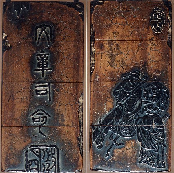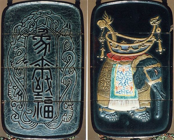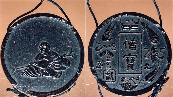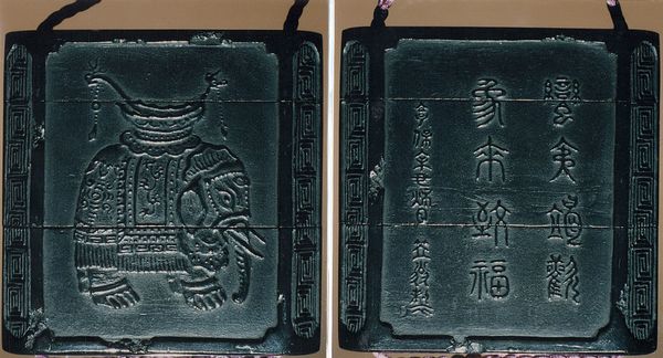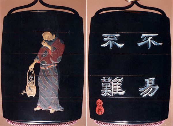 Editor: This striking object is a 19th-century Inro by Shibata Zeshin, "Case (Inro) in the Shape of an Ink Stick with Design of God of Longevity (Jurōjin), Reading beneath a Star Constellation". The details seem to be crafted from such fascinating materials! How do we interpret its significance beyond its apparent form? Curator: The materiality speaks volumes. Here we have an object mimicking another – an inro shaped like an ink stick, disrupting conventional distinctions between art, craft, and everyday utility. Consider the labor involved in its construction, the artisanal skills required to manipulate the materials. The "high art" of painting is referenced through the depiction of Jurōjin and calligraphy, yet it is inextricably linked to the object's function. Editor: So, you are pointing towards the process and societal function affecting its artistry. It really prompts us to rethink about separating the traditional concept of "art". The work evokes this question around production and functionality so interestingly. Curator: Precisely. This piece engages in a dialogue about art as not just a product of individual genius, but of material conditions, skill sharing, and its place within systems of production and use. This also extends to considering it being ‘wearable design’ which expands art from being separate of function. Think about how consumption of such object may imply social and economic status during that period. The way the craquelure or crackling on the surface creates visual depth—does that remind you of anything else? Editor: I suppose, the texture gives off some effects of something aged or naturally weathered, but on purpose! Do you think the aging also plays with our consumption value? Curator: Potentially. The aging and use as adornment invites speculation around labor, status, and the intertwined aesthetics and economics in Meiji-era Japan. We can understand it better when we focus our observation on the piece's intended societal placement. Editor: Right, so analyzing the object based on production processes and social contexts unveils broader artistic commentary. I will never be able to see wearable arts the same again! Curator: And hopefully, you will also remember to see art making through social factors and materials too.