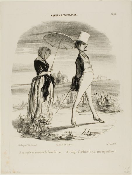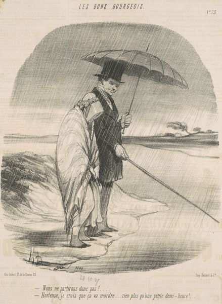 Editor: Here we have Honoré Daumier’s "Un homme sans asile…," a 19th-century lithograph drawing. The lone figure under the heavy rain really conveys a sense of isolation and vulnerability. What strikes you most about this print? Curator: It’s powerful, isn’t it? Daumier wasn’t merely depicting a homeless man. Consider the title—"A man without refuge is like a bird without a nest." In 19th-century France, this spoke volumes about class, industrialization, and displacement. How does his rendering contribute to social commentary? Editor: It does seem like the artist is showing a man out of place, away from home or any kind of comfort. Curator: Precisely. Think about who "home" was for during this period, and for whom it was inaccessible. The rising bourgeoisie versus the working class—Daumier repeatedly targeted the hypocrisy of the former while championing the plight of the latter in his work. Editor: So you are saying Daumier chose caricature as his artistic tool to critique power and offer his commentary about it? Curator: Yes! It's through the visual vocabulary of caricature and romanticized realism that he exposes social inequality. He challenges the prevailing social order, inviting us to confront uncomfortable truths. The drawing makes us feel empathetic for his unfortunate fate. Editor: That context definitely shifts my understanding. It makes me think about the present-day realities of displacement. Thank you for opening up this dimension! Curator: Art is never created in a vacuum. Connecting the work to its socio-political roots, and our present is where true engagement starts.