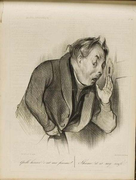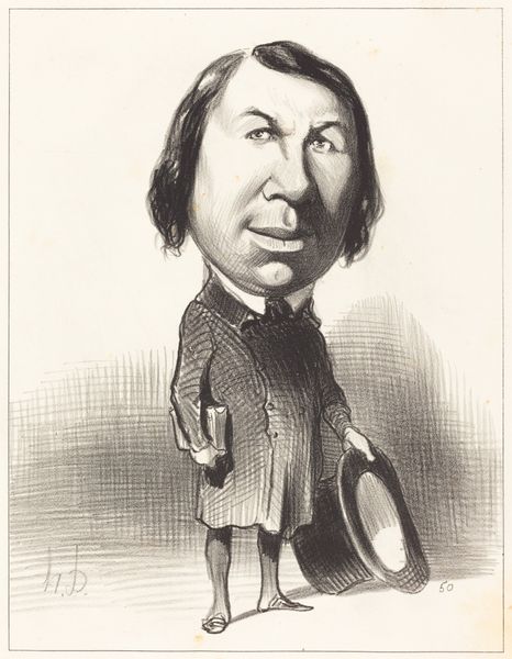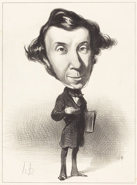 Editor: We are looking at "Charles Dupin," a lithograph created in 1849 by Honoré Daumier. It's a caricature, and the sitter's face seems really exaggerated. What can you tell me about this work, thinking about the time in which it was made? Curator: Well, Daumier was a master of social critique. Looking at this image within its historical context, it's important to remember the political climate of 19th-century France. Daumier frequently used caricature to comment on the bourgeoisie and political figures. Do you get the sense that this is flattering to the man he has represented? Editor: Not really, his head is huge compared to the rest of his body! Curator: Precisely. So how does that choice impact the message that he's trying to send, and more broadly, what do we make of the act of publicly displaying such an image at the time? Editor: I guess, making him look ridiculous might undermine his authority? Also, I’m curious if people would have known who Charles Dupin was at the time. Curator: Absolutely. And this wasn’t just about the individual; Daumier was often commenting on the entire social structure. The print medium allowed these critiques to circulate widely, reaching a broad audience. Did the museum or art market at that time validate Daumier's satirical depictions of influential figures, or was this mainly public art? Editor: Wow, thinking of it as public art and a social critique completely changes my perspective on this image! It is clear that Daumier wielded incredible power through his work. Curator: Indeed, his caricatures became a visual tool to critique the socio-political structures of his time, turning the very act of image-making into a political statement. Editor: This was really insightful; thank you!