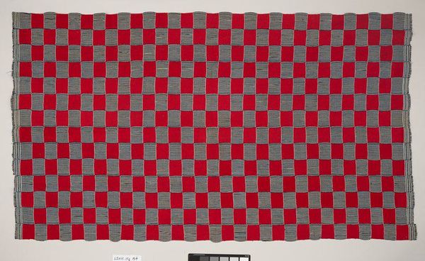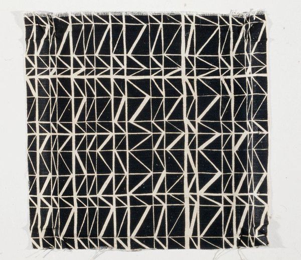 Editor: Here we have Anni Albers' "Black-White-Gray," a textile from 1964. It's strikingly methodical, a real exercise in geometry and texture. What design elements stand out to you? Curator: The beauty of this piece resides within the meticulous construction of its pattern. Observe how the artist uses the interplay of rectangular forms, carefully orchestrated through varying shades, to create depth. It encourages one to consider Albers's command of her medium. How does the materiality, the weave itself, inform your understanding of the composition? Editor: I hadn't thought about that consciously, but the texture definitely gives the piece a subtle dynamism, which makes it feel almost architectural to me. The individual threads aren't perfectly uniform, which keeps the geometry from feeling cold or clinical. It’s as though Albers created an image, not merely a textile. Curator: Precisely. Note how the interplay between light and shadow are essential to one’s perception. The geometric structure is mediated through subtle changes in tonal variation that lend themselves to both simplicity and the expression of pure, abstract form. The success hinges on the balanced tension that manifests from the integration of its geometric foundation with the inherent qualities of the textile. Would you say that the restricted color palette has any effect on the work’s impact? Editor: I think the limited palette forces you to pay even closer attention to the subtle gradations and the texture itself. Otherwise, maybe it would just fade into the background. Curator: A valid interpretation. By limiting the chromatic register, Albers emphasizes the critical structural elements that serve as the compositional underpinnings of this masterfully executed piece. What started as a question regarding technique resulted in a complex, dynamic composition. Editor: I definitely have a deeper appreciation for the choices she made in texture, color, and structure. It really is all about the details.