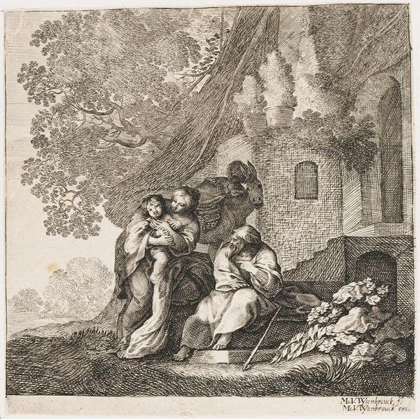 Editor: Ferdinand Kobell’s etching, “Girl and Boy,” captures a tender moment. I’m struck by the contrast between the rough, almost chaotic lines of the landscape and the softness of the figures. What do you see in this piece? Curator: It’s interesting to consider Kobell's image within the context of 18th-century social structures. How might this depiction of childhood innocence serve to reinforce or perhaps subtly critique contemporary ideals of domesticity and gender roles? Editor: That makes me think about how different the roles of women are today, and what hasn’t changed. Thanks! Curator: Indeed. It allows us to recognize the artwork as an active participant in the cultural dialogues of its time.