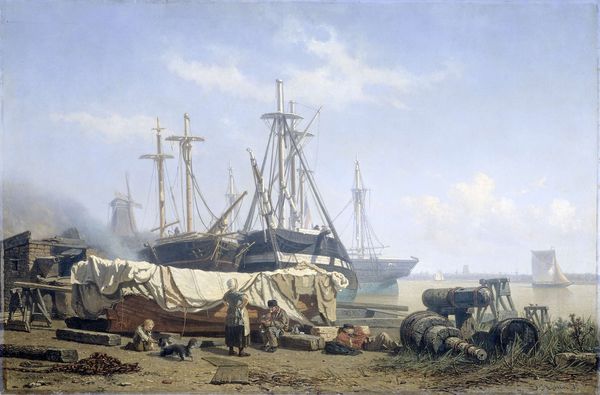 Curator: Andreas Achenbach painted "Low Tide" in 1837 using oil on canvas. Look at how this seemingly simple seascape speaks volumes. What are your first thoughts on it? Editor: Hmm, there's a stillness that belies a sense of potential chaos, you know? Like the calm after a storm, maybe? I find myself drawn to the grounded quality—earthy tones of sand and weathered wood against a bright sky and sea. A story of human presence meeting elemental power! Curator: Absolutely! The grounded feeling seems important in many Romantic depictions of maritime themes, to give some historical context. This shipwreck, while evocative of disaster, does possess its own strange beauty, transformed by the low tide’s reach. It seems emblematic of human frailty amidst nature's strength, a core theme within Romanticism. But notice too the presence of the people, and the implied narratives that they create here. Editor: That stranded boat certainly commands attention; a proud symbol rendered vulnerable, almost tragic. Are the people mourning a loss or perhaps strategizing what's next? Either way, their presence underscores the relentless nature of life – rebuilding or perhaps beginning anew following misfortune. A cyclical truth! Curator: Precisely. Consider how the wreck’s remnants take on added symbolic value because of the humans. Now that you’ve spoken about potential misfortune and perhaps rebuilding, think about the symbolism within the overturned ship and prone figures! Could they symbolize past failings, dormancy, and then eventual hope for rebirth after confronting struggles? Editor: Whoa, okay, like collective psyche or maybe a reflection of humanity confronting obstacles! The Romantic era always leaned into nature's transformative possibilities after devastation... Curator: Precisely! What does "Low Tide" provoke for you personally, in thinking about symbolic representation and transformation? Editor: Something about acceptance; letting go in order to create fresh avenues... It serves to encourage introspection by pointing toward resilience when everything seems shattered or submerged... Well, Andreas’ perspective resonates just because that stranded vessel symbolizes navigating our messy humanness; always adapting amidst uncontrollable variables! Curator: That's beautifully articulated. Andreas Achenbach challenges us, using images rich in maritime and symbolic implications, not merely to record coastal settings but reflect also on civilization versus untamed forces, as well as to interpret human endurance amidst change, creating an emotive exploration! Editor: You're absolutely right. Through visual representation and reflective context like yours, his seascape has resonated for years, spurring further investigation with ongoing implications. Thank you for deepening that reflection.