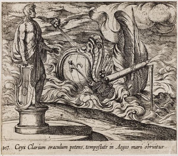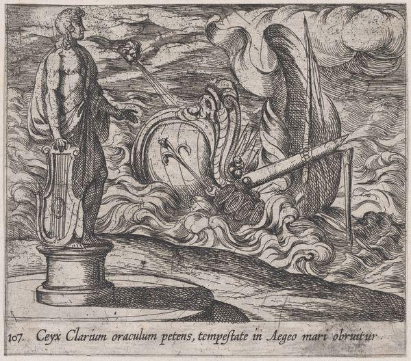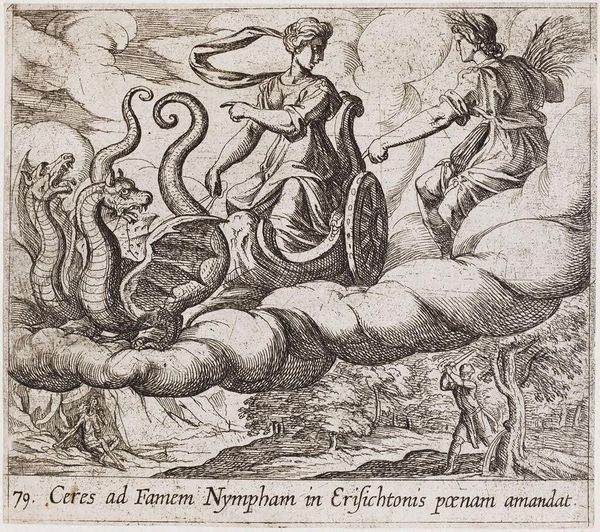 Curator: Look at the intricate lines in this engraving from 1606 by Antonio Tempesta titled 'Plate 79: Ceres Ordering Erysichthon's Punishment,' part of his series based on Ovid’s 'Metamorphoses'. Editor: My first thought? It's chaotic and precise all at once. Like a bad dream rendered with absolute clarity. Curator: Absolutely. The composition is a cascade. Ceres, goddess of agriculture, rides her dragon-drawn chariot on a cloud, indicting a nymph while an ordinary mortal chops away at a tree below, apparently inviting the goddess’s wrath. It’s classic baroque dynamism, filled with underlying commentary on our impact upon the natural world and divine retribution. Editor: Retribution is right! She looks furious. You can almost hear the screech of those dragon-serpents as she orders starvation, personified in that skeletal nymph to wreak havoc. Gives me chills. What a way to represent divine power. It’s so… theatrical. Curator: Tempesta really captures the drama inherent in Ovid's narrative. It's not just history painting; it's allegory, packed with visual metaphors. Ceres, normally associated with bounty and nourishment, is here orchestrating famine. The scales are upset by Erysichthon’s hubris, by cutting down her sacred grove. Editor: Yeah, you definitely get the feeling of disruption, upsetting the natural order. And he’s such a tiny figure, this poor tree-chopper, so powerless in the face of divine rage! The engraving itself, with its precise lines, somehow heightens the feeling of cold, inescapable fate. Curator: Indeed. Every detail has symbolic weight, doesn’t it? Editor: It really does. What seemed initially just complex now feels deliberate. Curator: Well, I find that exploring how visual culture is used in historical stories helps me understand my connection to people who may not live now, but live on in cultural memory. Editor: This piece feels both so old and remarkably resonant. Kind of makes you want to reconsider your carbon footprint before lunch, eh?